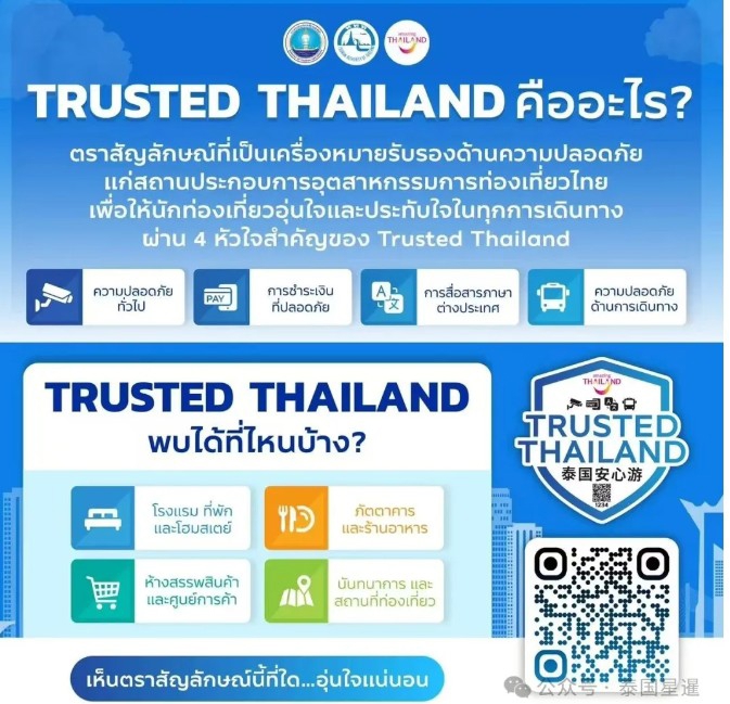 据悉,“信赖泰国”标识主要涵盖四类经营场所:1.酒店及家庭旅馆;2.餐厅;3.百货商场;4.旅游景点及娱乐场所。经营场所要获得该标识,必须通过安全保障、支付安全管控、外语沟通能力以及出行安全等方面的审核。具体包括:安装监控摄像头、防火措施等安全设施;支持移动银行、支付宝或微信支付等便捷支付方式;配备能够使用外语沟通的工作人员或翻译设备;确保前往经营场所的交通方式便捷且安全。
