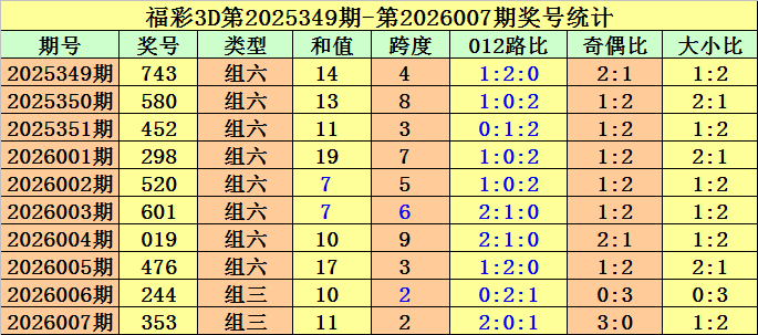 开奖回顾:第2026007期福彩3D奖号为353。